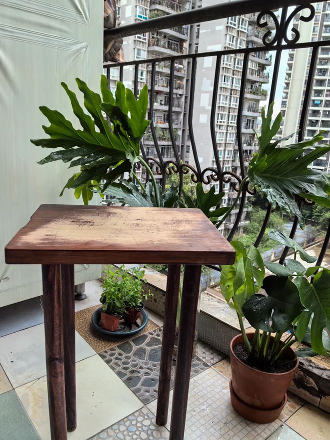 那么就可以选择将上面的把手去掉,再准备好几根木棍,将其改造成一个小的边几。