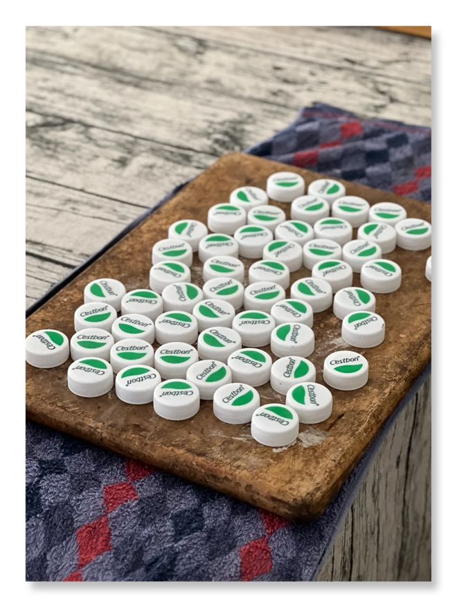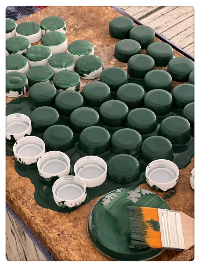 除了旧菜板以外,大家只需要再准备一些瓶盖,然后将瓶盖固定在切菜板上,合适的位置再进行一下简单的粉刷。